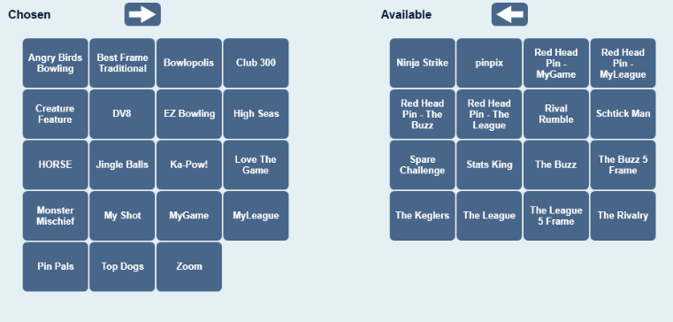On the left side, is the chosen list. This is a list of the games that are available for the bowler to select at the tablet. To remove a single game from the list, click on it, and it will move from the chosen list on the left to the available list on the right.