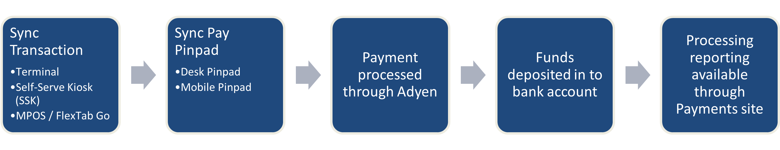 Terminal Payments – This is the process flow for sale transactions completed through a Sync Terminal, Service Kiosk, or Mobile Point of Sale tablet.