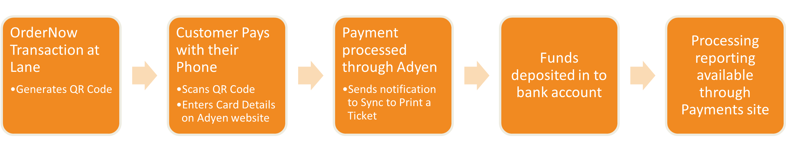 - Payment processed through Adyen – Once the payment has been processed, the guest will see a completion screen on their mobile device as well as on the Sync tablet. The Sync system inside the center will continue to check with Sync Pay to verify the transaction has been paid. Once Sync has been given confirmation, the transaction is completed and food orders print out as configured within Sync (ROPs, Order Management screen, etc).